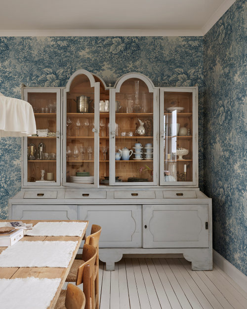 Baserat på ett textilt tryck från 1800-talets Frankrike med lummiga skogsgläntor som lägger sig som ett omfamnande täcke över väggarna. Forest Toile, Blue, har blå toner på en beige bakgrund. Mönstret finns i flera färgsättningar; sand, röd och grön. Designad av Studio Sandberg.
