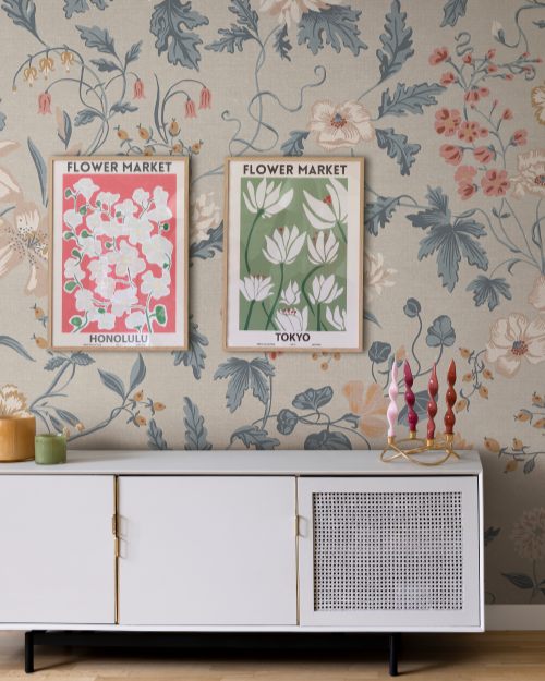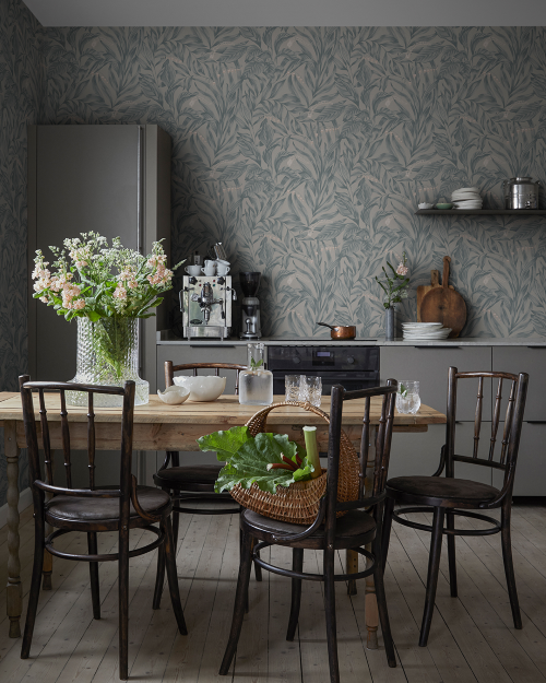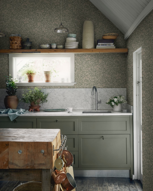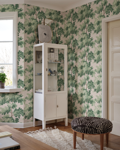Tänk att vila blicken på ett samstämt rum av mjukt grönskande klematis och kaprifol, ett välbalanserat mönster som stillar sinnet till ro. På bilden i färgställningen Garden Green. Designad av Karolina Kroon.