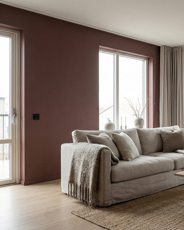 En varm rödbrun kulör med tydlig jordton som ger rummet djup och karaktär. Ljungbacke skapar en ombonad känsla och fungerar fint som accent tillsammans med ljusare neutrala kulörer och naturmaterial.