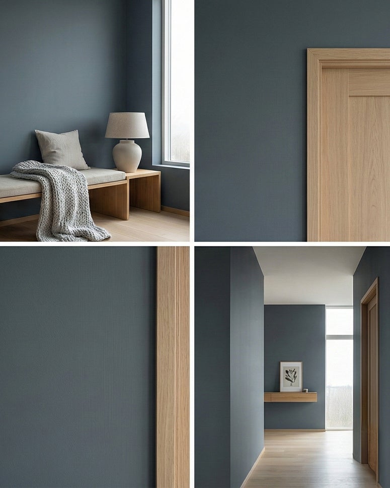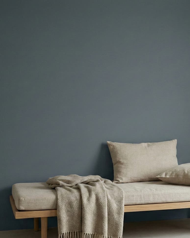 En sval mörk blåton med tydlig struktur. Skuggklint skapar lugn och djup och fungerar fint i rum där man vill ha en mer markerad men ändå balanserad färgsättning. Ger en varm och ombonad känsla som passar väldigt bra i såväl sovrum som hall, kök och vardagsrum. Tillsammans med snickerier målade i Nordsjö Ambiance Superfinish Matt får rummet en elegant inramning där lister, dörrar och andra detaljer lyfter kulörens djup.