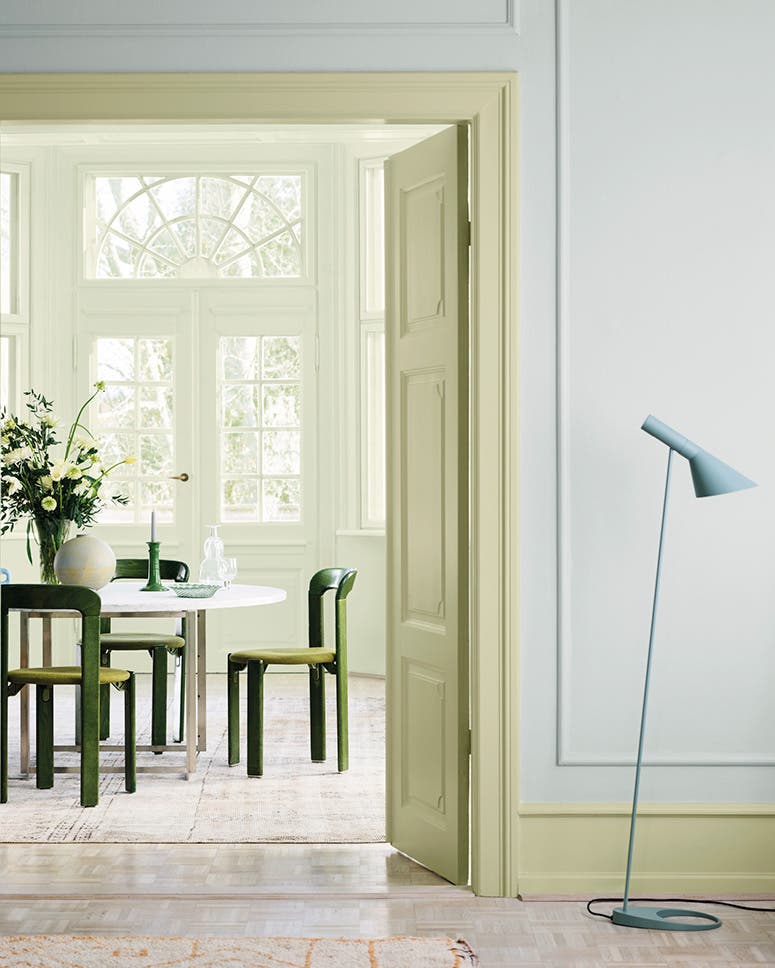 Jotun LADY Spring Breeze, 6167 (yttre vägg), Sunny Green, 8596 (lister) och Secret Green, 7718 (inre rum)