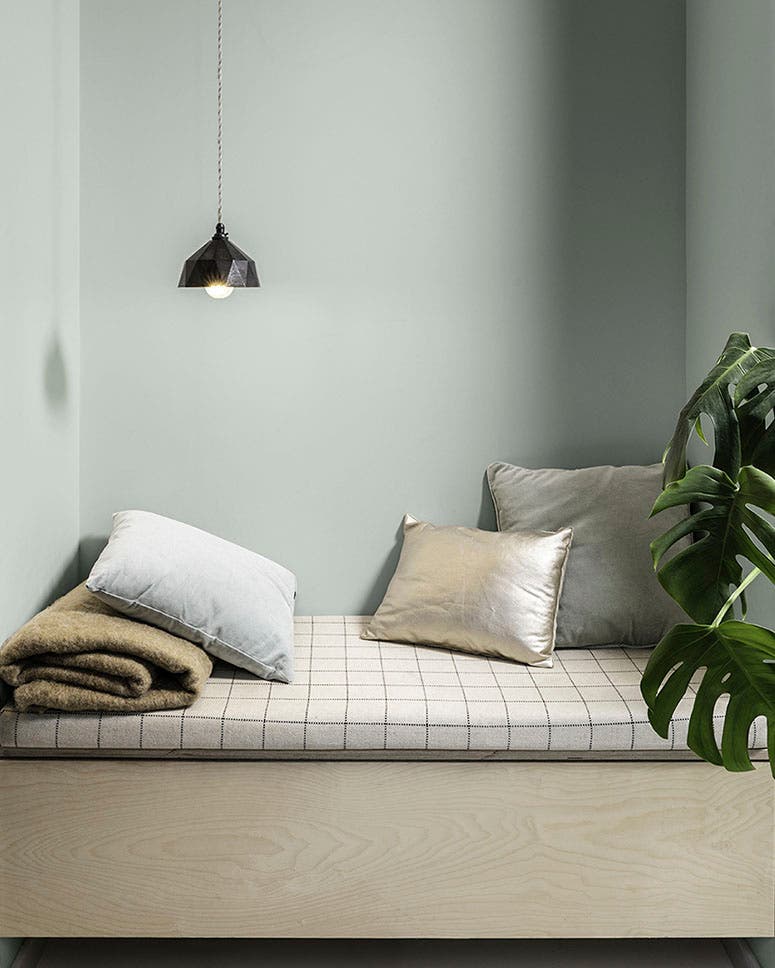 Jotun Subtle green, 7685 (yttersta rummet), Mindful green, 7686 (lister) och Pistachio, 7386 (innersta rummet)