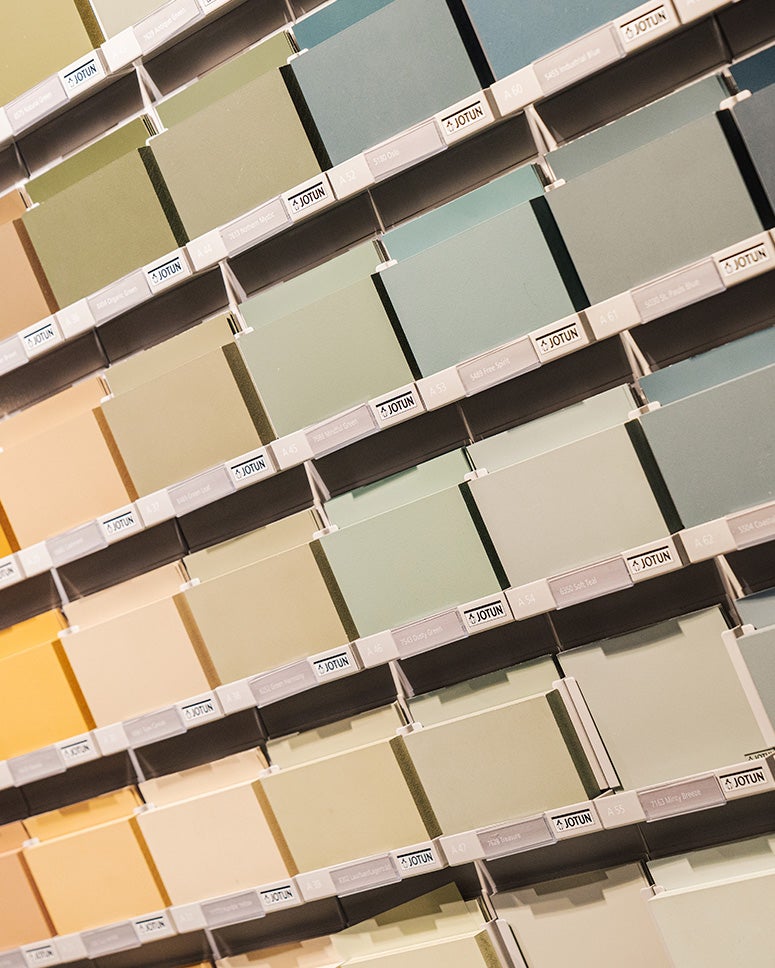 Färgvalet har stor betydelse för känslan i ett rum. Ljusa nyanser ger en rymlig och lugn atmosfär, medan mörkare färger skapar en mer dramatisk och mysig känsla. Kombinera gärna flera färger eller använd effektmålning för att skapa en unik känsla. Med våra leverantörer Nordsjö och Jotun har vi en stor utställning av kulörer i butiken, välkommen in till Nyhems Färghus för att titta på kulörerna i verkligheten innan du bestämmer dig – en uppmålad kulör upplevs oftast starkare än det lilla kulörprovet. Och självklart kan du köpa med dig en provburk hem från butiken, så kan du uppleva kulören hemma innan du bestämmer dig.